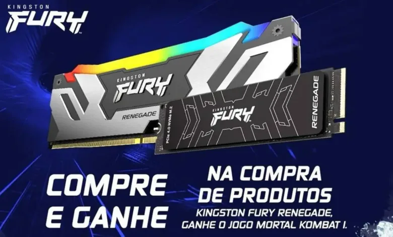 Ao adquirir um produto da linha Kingston FURY Renegade, que inclui as memórias DDR4/DDR5 e os SSDs – incluindo o mais recente, G5, nas lojas parceiras KaBuM! e Terabyte, o comprador recebe uma chave de ativação para o jogo Mortal Kombat 1 (versão PC) por e-mail.