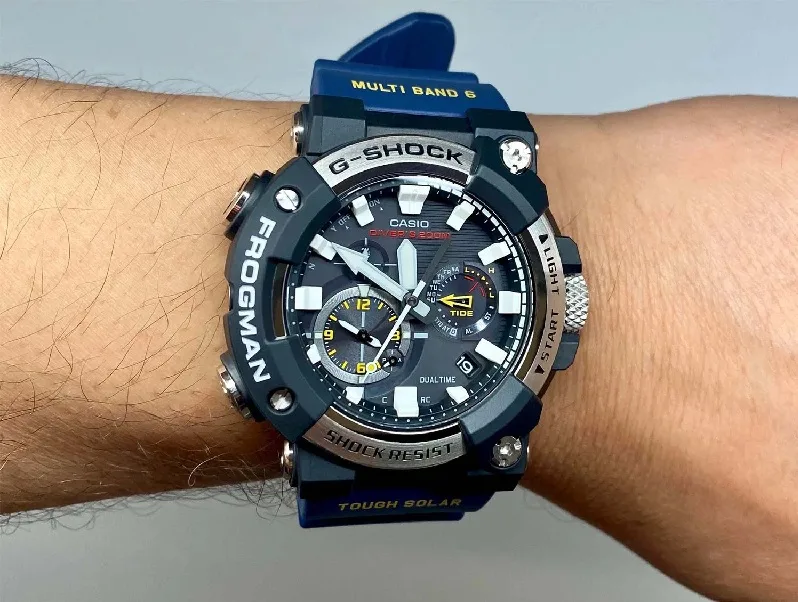 No ambiente aquático, o Frogman GWF-A1000 se consolidou como um dos principais modelos da marca. Com resistência à água de até 200 metros, cronômetro específico para mergulho e certificação ISO, o relógio atende às demandas de mergulhadores profissionais e entusiastas que enfrentam pressão, profundidade e baixa visibilidade. O modelo traz estrutura monobloco em resina reforçada com fibra de carbono, garantindo leveza e alta durabilidade mesmo em condições extremas. Seu design inclui visor em vidro de safira com revestimento antirreflexo, que assegura legibilidade em ambientes subaquáticos.