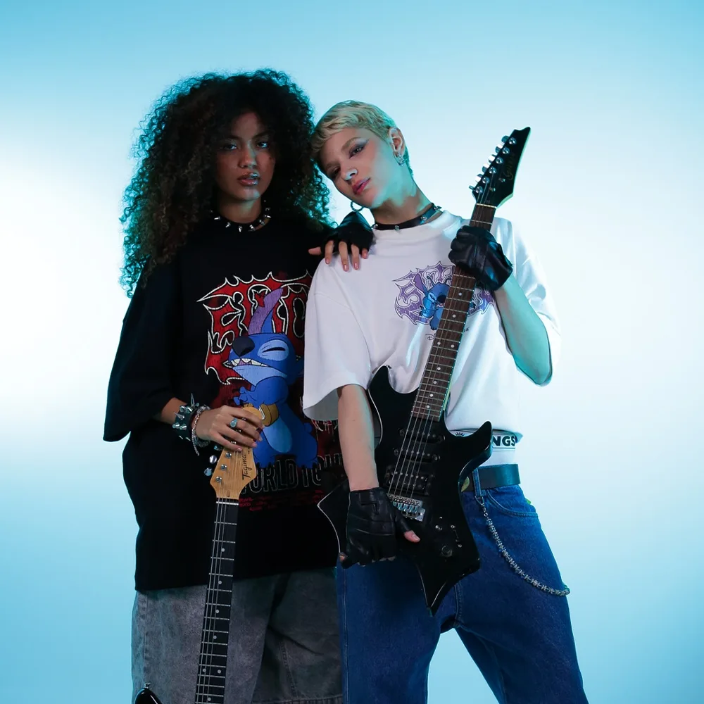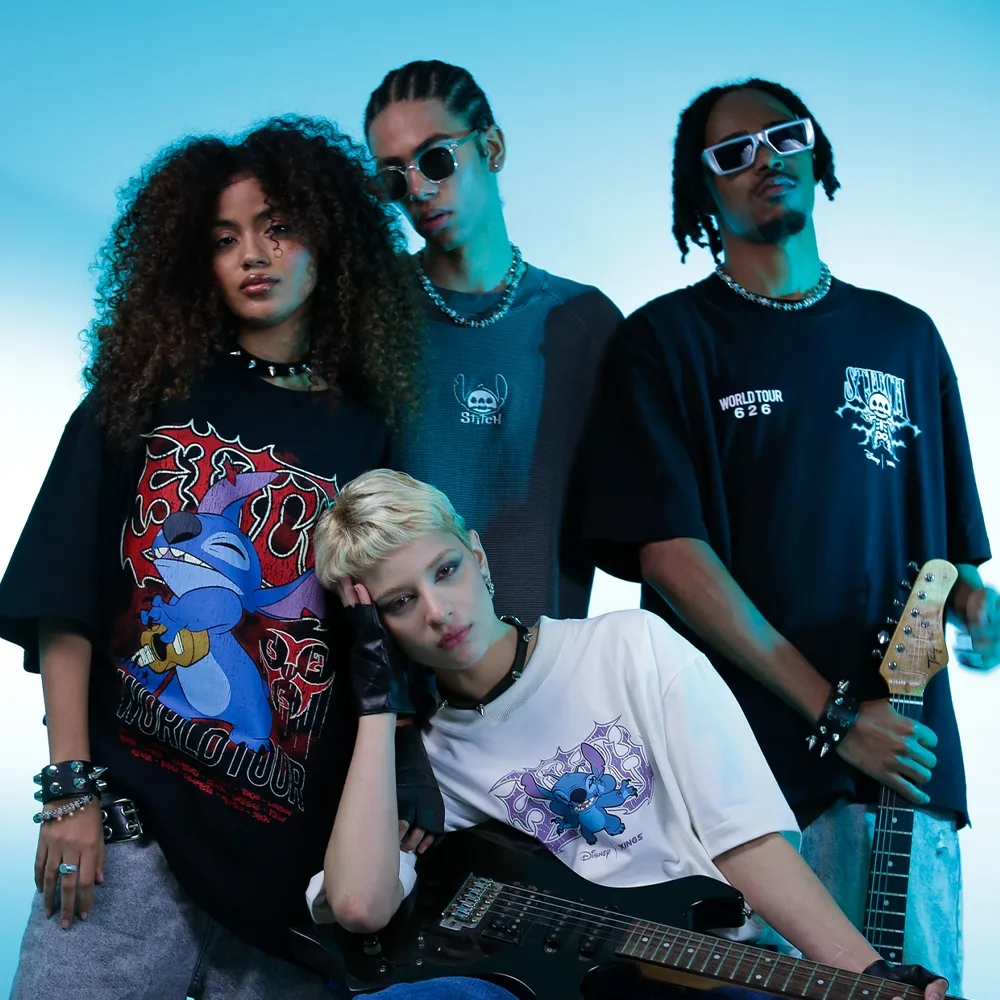 Dessa conexão surgiu o conceito de uma “World Tour” do Stitch, inspirado nos clássicos merchs de bandas. As peças trazem tipografia exclusiva desenvolvida por Zero, inspirada na estética do Black Metal, com texturas, tecidos estonados, raios e uma força gráfica que une cultura pop e streetwear.